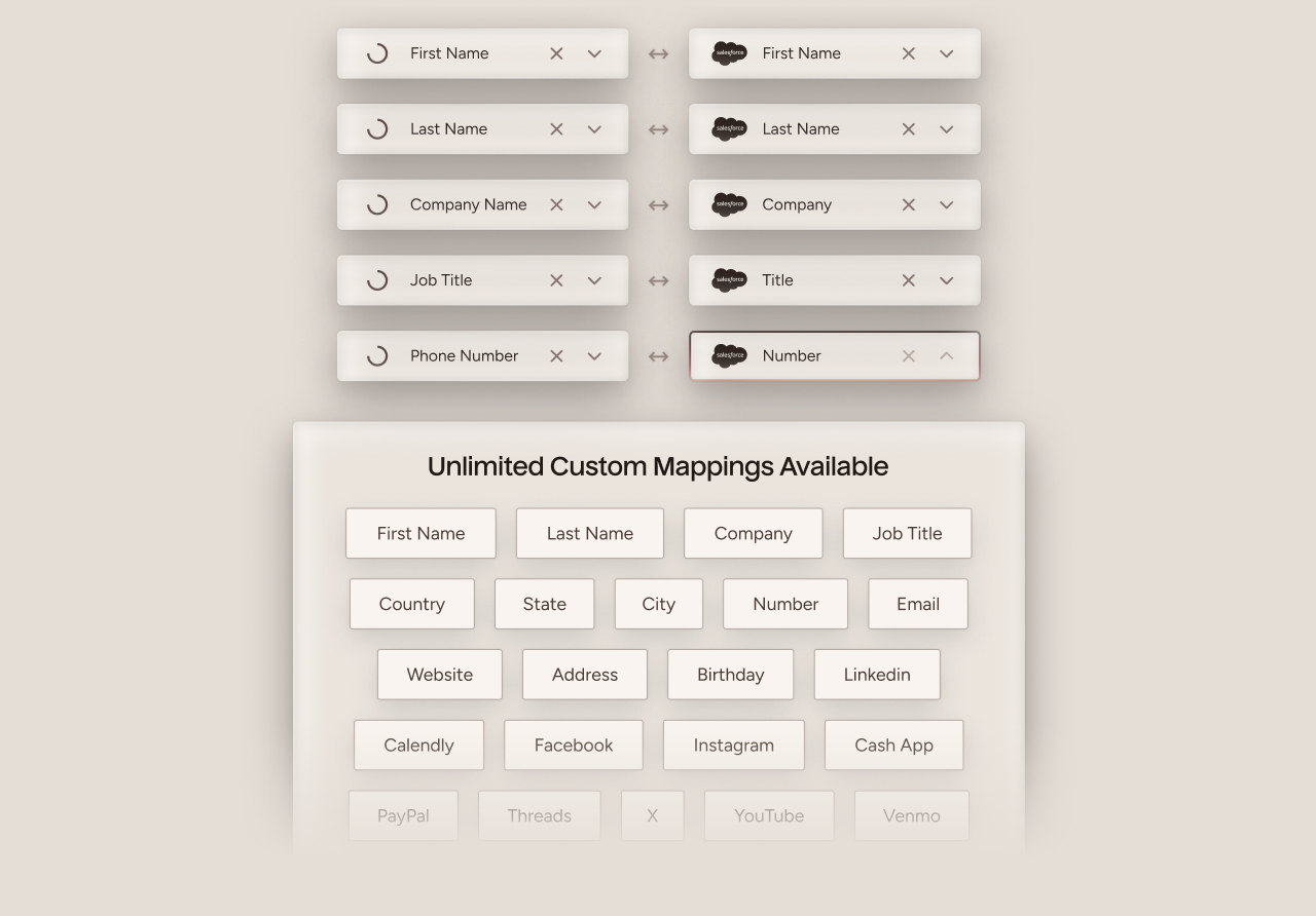 We know every CRM is configured differently, so Popl’s integrations support unlimited custom field mappings across all your different CRM objects. With built-in deduplication, auto-tagging, and advanced configuration options, our CRM integrations adapt to your business, not the other way around.