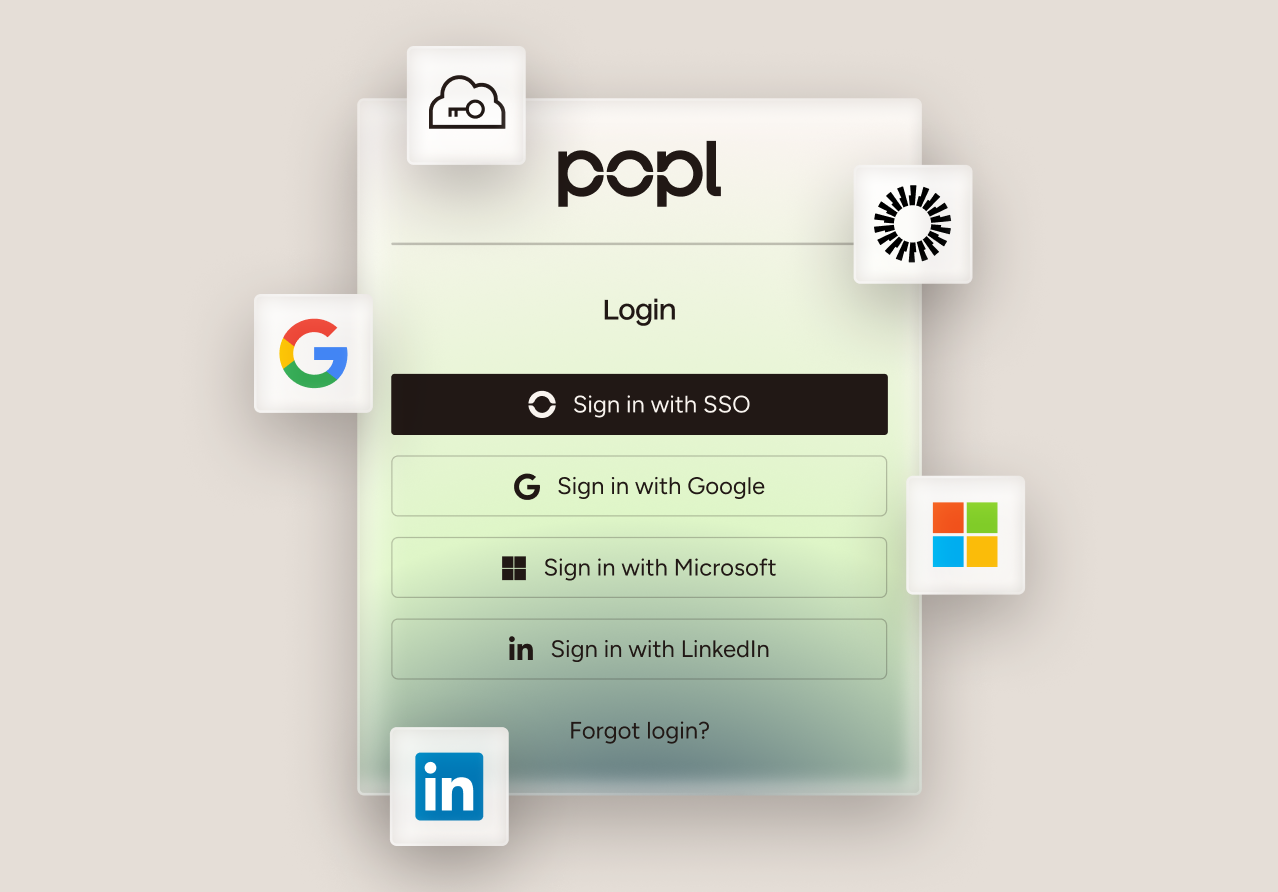 Popl integrates with your existing SSO providers to deliver secure, company-wide authentication with minimal friction. Employees can log in using the identity tools your organization already trusts—no extra passwords to create, manage, or remember.